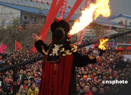 12月31日,川劇著名變臉演員在四川地震極重災(zāi)區(qū)的擂鼓鎮(zhèn)板房區(qū)前,展示噴火技藝慰問(wèn)北川縣上萬(wàn)民眾干部,以迎元旦文藝表演告別難忘的2008年。中新社發(fā) 賈國(guó)榮 攝