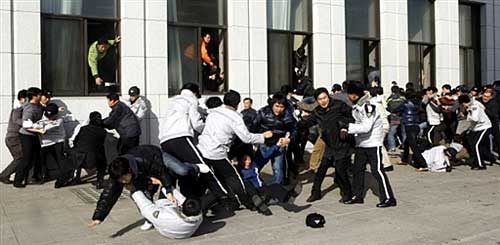 1月3日,在韓國首都首爾,警察(穿灰白色上衣者)阻止反對黨成員爬窗進(jìn)入國會(huì)。韓國主要反對黨民主黨議員自2008年12月26日起占據(jù)了國會(huì)大會(huì)議廳內(nèi)的議長座位,以阻止執(zhí)政的大國家黨單方面通過一系列有爭議法案。