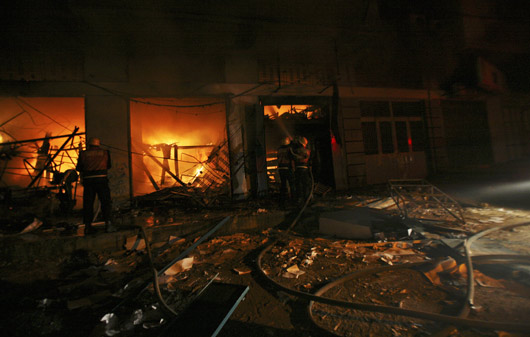 以色列的導(dǎo)彈襲擊摧毀了加沙城的一個印刷廠,巴勒斯坦消防員試圖撲滅火災(zāi)。