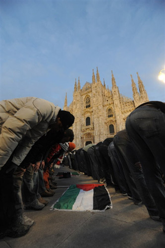 1月3日,在意大利米蘭,當(dāng)?shù)厝罕娕e行集會活動,對在加沙地區(qū)遭空襲的巴勒斯坦死難者進(jìn)行祈禱,抗議以色列襲擊加沙。