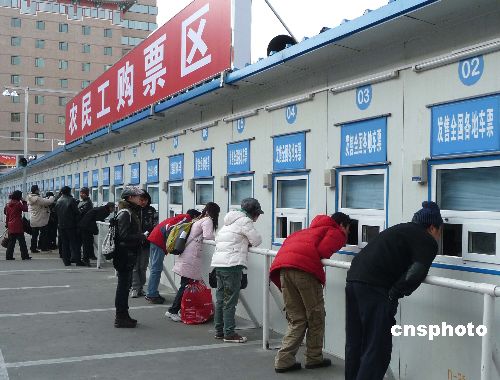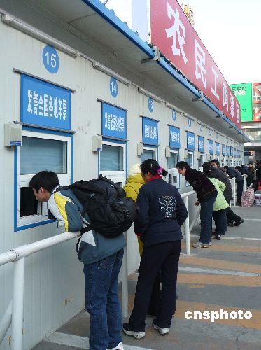 1月5日,北京西站西廣場(chǎng)上的70余個(gè)春運(yùn)“臨時(shí)售票窗口”開(kāi)始啟用,旅客紛紛在此購(gòu)買(mǎi)去往全國(guó)各地的火車(chē)票。據(jù)悉,2009年北京的春運(yùn)工作已從原來(lái)的1月11日提前至1月1日,2月19日結(jié)束,為期50天。今年春運(yùn)的特點(diǎn)是學(xué)生流和民工流探親流三流重疊,春運(yùn)壓力空前集中。針對(duì)近日來(lái)迅猛增長(zhǎng)的節(jié)前客流,春運(yùn)期間北京站和西站將會(huì)在站前廣場(chǎng)開(kāi)辟臨時(shí)售票窗口,方便旅客購(gòu)票。
