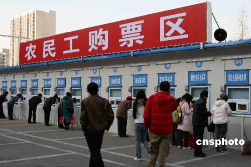 2009年1月5日,北京西站北廣場(chǎng)西側(cè),首批70個(gè)農(nóng)民工購票區(qū)臨時(shí)售票窗口對(duì)外開放。中新社發(fā) 任丘 攝