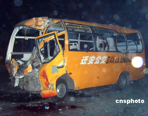 1月6日14時(shí)25分許,河北省遷安市發(fā)生一起重大交通事故。在遷安市祺光路與彭李路交叉口處,一名個(gè)體司機(jī)駕駛大貨車與遷安市公交公司13路公交車相撞,造成公交車兩名司乘人員當(dāng)場(chǎng)死亡,在送往醫(yī)院途中死亡一人,經(jīng)搶救無效死亡三人,另四名傷者正在醫(yī)院救治。 中新社發(fā) 翟羽佳 攝