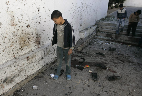 以色列部隊1月6日攻擊了加沙地區(qū)三處由聯(lián)合國設(shè)立的學校,造成數(shù)十名在學校內(nèi)逃避戰(zhàn)火的民眾喪生,另有百余人受傷。圖為巴勒斯坦兒童站在被以軍襲擊的聯(lián)合國學校外。