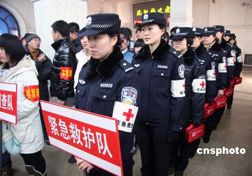 2009年1月7日,在沈陽(yáng)站候車室8名身佩紅十字袖標(biāo)英姿颯爽的沈鐵公安紅十字應(yīng)急救護(hù)隊(duì)的女警正式上崗,這是全國(guó)鐵路公安機(jī)關(guān)第一支專業(yè)應(yīng)急救護(hù)隊(duì)伍。中新社發(fā) 趙敬東 攝