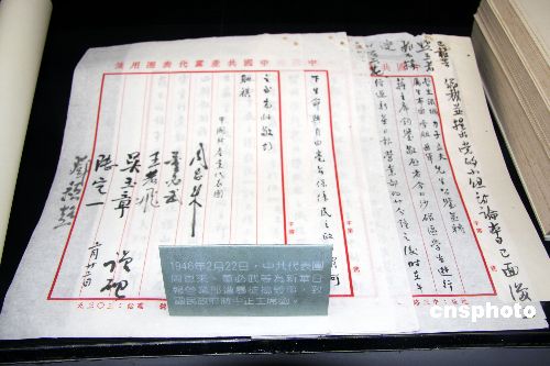 1月7日,中國國民黨中央黨部黨史展覽廳在此間推出“跨越三世紀——中國國民黨的變與不變”展覽,展出許多珍貴史料,包括周恩來的手稿。圖為1946年,周恩來為新華日報營業(yè)部遭搗毀事,致函當時的國民政府主席蔣介石的手稿。中新社發(fā) 陳立宇 攝