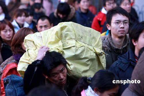 圖為北京西站的旅客扛著大包隨人流移動。中新社發(fā) 鄭雄增 攝
