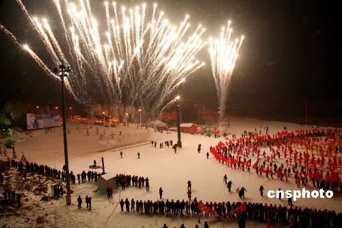 1月11日晚,銀裝素裹、晶瑩秀麗的沈陽棋盤山冰雪大世界歡聲雷動(dòng),“2009中國沈陽國際冰雪節(jié)、盛京燈會(huì)、關(guān)東廟會(huì)”拉開帷幕,這一冬日盛會(huì)為期35天。中新社發(fā) 黃金昆 攝
