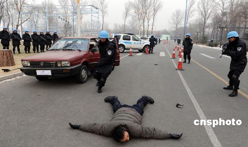 維和防暴隊(duì)員進(jìn)行定點(diǎn)查車(chē)訓(xùn)練。中新社發(fā) 由永懷 攝