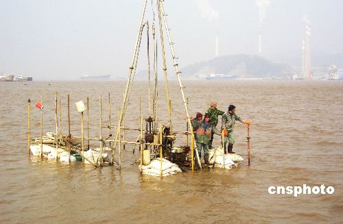 1月12日9時(shí)30分許,4名大橋施工員在浙江省臺州市海門港椒江二橋建設(shè)工地上測量時(shí),被上漲的潮水困在港內(nèi)工地上。接到報(bào)警后,臺州邊防支隊(duì)迅速派遣公邊艇前往營救,經(jīng)過近1個(gè)時(shí)努力,4人終于成功脫險(xiǎn)。中新社發(fā) 郟策 攝