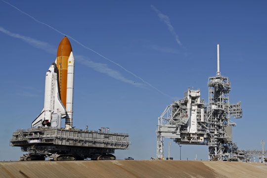 當?shù)貢r間14日,美國“發(fā)現(xiàn)”號航天飛機“坐”著履帶車經(jīng)過4英里的“旅行”,被運上位于佛羅里達州肯尼迪航天中心的發(fā)射臺。按計劃它將于2月12日發(fā)射升空前往國際空間站。