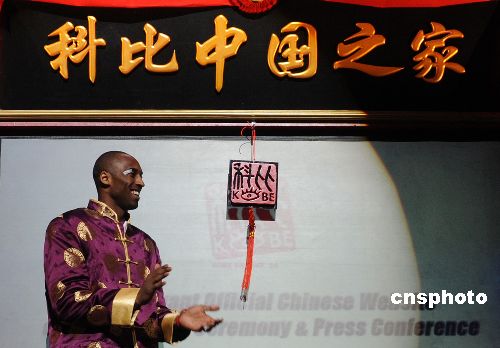 當(dāng)?shù)貢r(shí)間一月十五日,美國(guó)NBA巨星科比·布萊恩特中文官方網(wǎng)站“科比中國(guó)之家”在洛杉磯正式開通,身著唐裝的科比親自參與并親自開通網(wǎng)站。中新社發(fā) 張煒 攝