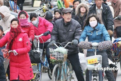 2009年1月22日,江蘇省贛榆縣市民在寒風中出行。受強冷空氣東移南下影響,江蘇全省迎來強降溫寒潮天氣,蘇北沿海溫度最低降至零下8攝氏度以下,風力9~10級。當?shù)貧庀蟛块T發(fā)布寒潮黃色預警信號,并提醒有關(guān)單位和個人做好防寒保暖和防風工作。中新社發(fā) 司偉 攝