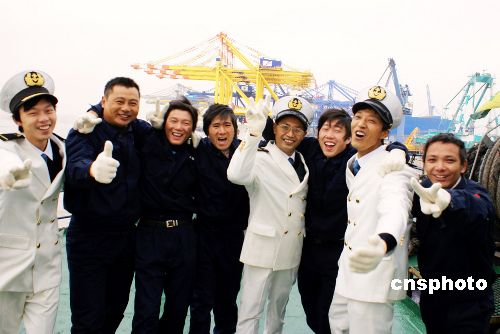 江蘇籍貫的“振華4號(hào)”船員斗志昂揚(yáng)地在甲板上向江蘇家鄉(xiāng)父老歡呼。中新社發(fā) 李根 攝