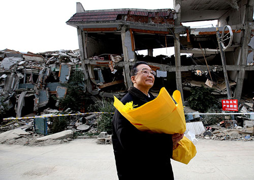 1月24日至25日,中共中央政治局常委、國務院總理溫家寶來到四川受災最為嚴重的北川、德陽、汶川等地,和災區(qū)人民一起過年。這是1月24日,溫家寶專程來到北川縣城遺址向大地震中遇難的同胞們獻花。作者:姚大偉