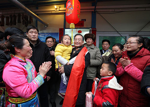 1月24日至25日,中共中央政治局常委、國務院總理溫家寶來到四川受災最為嚴重的北川、德陽、汶川等地,和災區(qū)人民一起過年。這是1月25日,溫家寶在汶川映秀鎮(zhèn)板房安置小區(qū)與群眾一起過年。作者:姚大偉