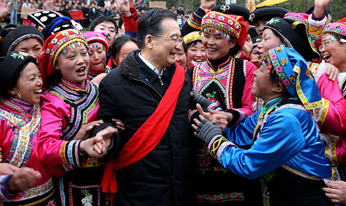 1月24日至25日,中共中央政治局常委、國(guó)務(wù)院總理溫家寶來(lái)到四川受災(zāi)最為嚴(yán)重的北川、德陽(yáng)、汶川等地,和災(zāi)區(qū)人民一起過(guò)年。這是1月24日,溫家寶在北川縣擂鼓鎮(zhèn)貓兒石村看望羌族群眾。作者:姚大偉