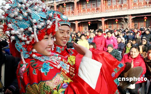 1月27日 (大年初二),北京大觀園十四屆紅樓廟會(huì)吸引眾多假日游客,本屆廟會(huì)以弘揚(yáng)中華傳統(tǒng)文化為宗旨,以展現(xiàn)紅樓文化為主題,呈現(xiàn)出改革開放30年來新北京、新宣武的精神風(fēng)貌。廟會(huì)主要活動(dòng)有“元妃省親”、“寶黛成婚”“賈母賀壽”、紅樓文化展覽--木版年畫展、紅樓夢人物火花展以及紅樓美食展示區(qū)等。圖為在北京大觀園2009年紅樓廟會(huì)上別具創(chuàng)意的“寶黛成婚”。中新社發(fā) 錢興強(qiáng) 攝