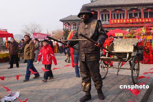 1月30日,河南省開封市翰園碑林里布置的真人活體雕塑引來不少游人駐足觀看。春節(jié)期間,河南省開封第十屆翰園春節(jié)祭祖大廟會上推出不同造型的真人活體雕塑,逼真的藝術(shù)效果讓人耳目一新。