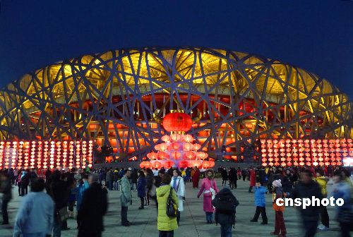 2009年1月31日傍晚,在北京奧林匹克公園中心區(qū)內(nèi),“金牛獻(xiàn)福”、“年年有余”、“鴻福滿倉”等鋼材結(jié)構(gòu)的雕塑及數(shù)千個大紅燈籠,在牛年春節(jié)期間首次被安放在園區(qū)人流較集中的地方,與“鳥巢”、“水立方”交相輝映。中新社發(fā) 玉龍 攝