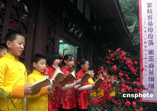 圖為來自成都草堂小學(xué)的百名小詩童齊誦杜甫與高適唱和的詩作,一表心中敬意。中新社發(fā) 楊杰 攝