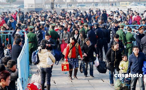 2009年1月31日,旅客們正在南昌鐵路局九江火車(chē)站準(zhǔn)備上車(chē)。隨著春節(jié)長(zhǎng)假接近尾聲,南昌鐵路局客流大幅增長(zhǎng)。1月31日,該局發(fā)送旅客42.6萬(wàn)人,同比增長(zhǎng)18.79%。為應(yīng)對(duì)節(jié)后客流高峰,南昌鐵路局開(kāi)行臨客73列,臨客開(kāi)行列數(shù)為2009年春運(yùn)以來(lái)最高值。