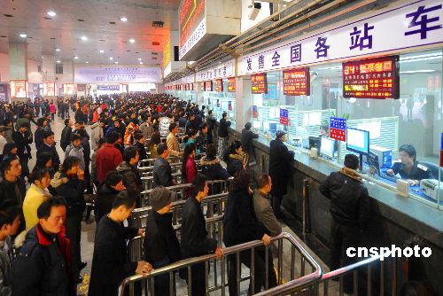 2009年2月1日消息,成都車站今年春運(yùn)在原有67個(gè)售票窗口的基礎(chǔ)上新增臨時(shí)窗口50個(gè),新開設(shè)客票代售點(diǎn)143個(gè),有效分流車站售票壓力。今年成都車站節(jié)后春運(yùn)“買票難”得到明顯緩解。中新社發(fā) 曹寧 攝