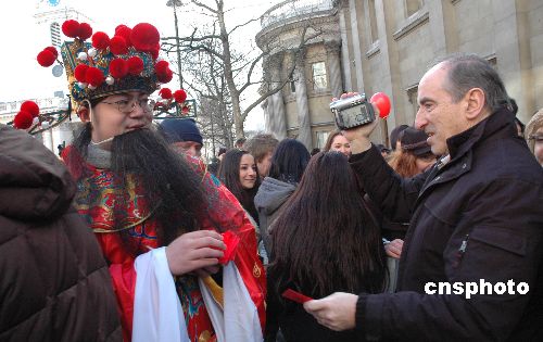 圖:中國“財神爺”倫敦派發(fā)新年紅包