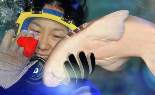 為迎接情人節(jié)到來(lái),2月1日,日本首都東京的一個(gè)水族館,潛水員給鯊魚(yú)喂食紅心形的魚(yú)食。這一充滿浪漫情調(diào)的喂食活動(dòng)將持續(xù)兩周。