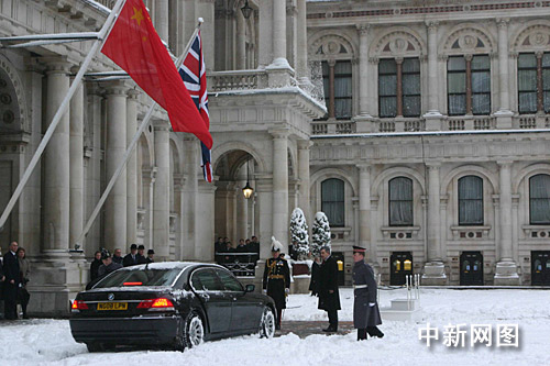 倫敦當(dāng)?shù)貢r間二月二日上午八時三十分許,正在這里進行正式訪問的中國總理溫家寶前往英國外交部,出席布朗首相舉行的歡迎儀式。圖為溫家寶座車駛向觀禮臺,英國首相布朗(右二)在車旁迎接。 中新社記者 張朔 攝