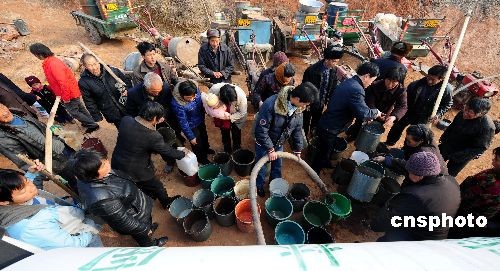 汝陽縣城關(guān)鎮(zhèn)張河村,村民們正在用各種裝水工具接鎮(zhèn)政府送來的飲用水。中新社發(fā) 高山岳 攝