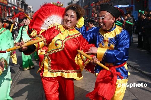 元宵節(jié)來臨,北京前門大街舉行民間花會踩街活動,借此宣告修繕一新的前門大街正式開街。踩街是一種中國傳統(tǒng)民間民俗藝術(shù)表演形式,類似國外的花車游行,表演隊伍邊行進邊表演,百姓沿途觀看。中新社發(fā) 杜洋 攝