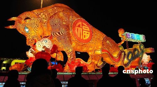 2月8日晚上,浙江杭州各文化廣場(chǎng)的“牛”燈都亮起來(lái)了,吸引了眾多市民前來(lái)觀看。中新社發(fā) 引煒 攝