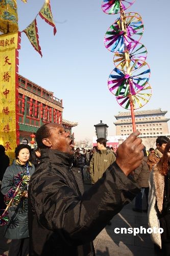 元宵節(jié)來(lái)臨,北京前門大街舉行民間花會(huì)踩街活動(dòng),一名外國(guó)觀眾手舉風(fēng)車玩得很過(guò)癮。踩街是一種中國(guó)傳統(tǒng)民間民俗藝術(shù)表演形式,類似國(guó)外的花車游行,表演隊(duì)伍邊行進(jìn)邊表演,百姓沿途觀看。中新社發(fā) 杜洋 攝