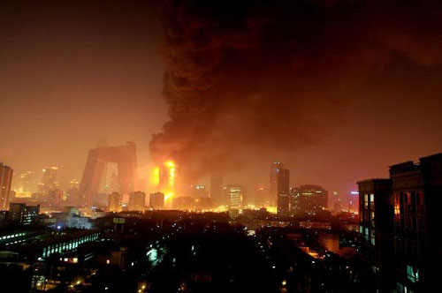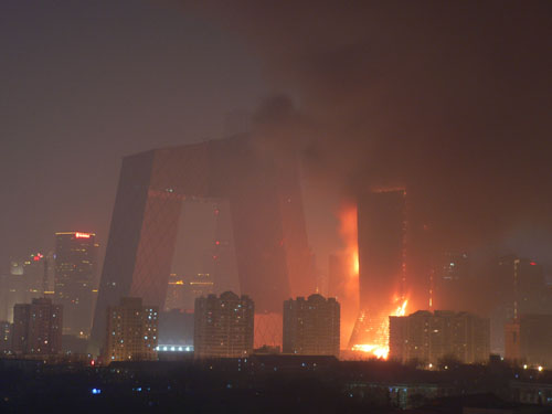 與央視新大樓(俗稱“大褲衩”)齊高的配樓已經(jīng)被大火所包圍,火柱沖天,一公里范圍內(nèi)天空落下像雪片一樣的灰燼。