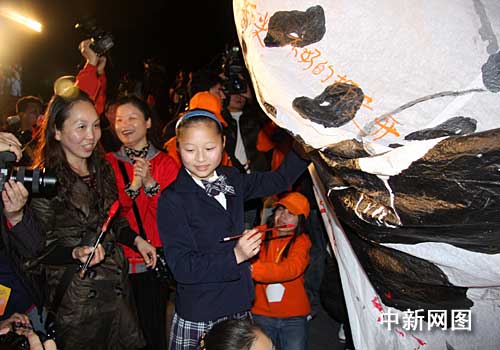 圖為應(yīng)邀隨團來臺的十三歲四川“抗震救災(zāi)英雄少年”陽玉潔(中)正準備在四川成都東羽蜀都燈會提供的印有大熊貓團團圓圓圖案的主燈上題字祈愿。記者 陳立宇 攝