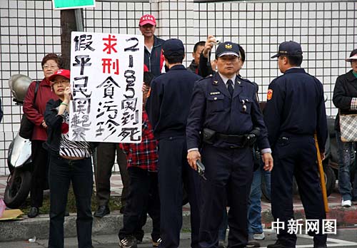圖:民眾在臺北地院門口舉標(biāo)語牌抗議吳淑珍