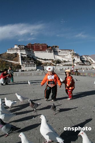 布達(dá)拉宮廣場上的孩童與鴿子。中新社發(fā) 扎西朗杰 攝