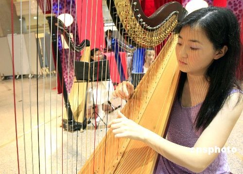 二月十二日,香港時代廣場舉辦情人節(jié)“I Love you Day”活動。美國國際豎琴大賽史上首位華人金獎得主于丹在場演奏助興。中新社發(fā) 張勤 攝