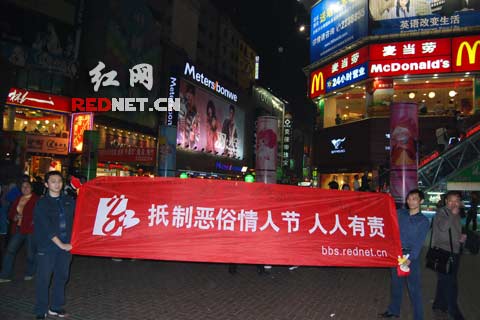 “快來看,抵制惡俗情人節(jié),人人有責(zé)!這活動真好,你還過什么情人節(jié)啊?!”12日晚上7點(diǎn)半,在長沙黃興南路步行街上,兩名男子拉起了一個約四米長一米寬的抵制情人節(jié)的橫幅,引起了許多路人的興趣,還有不少人上前簽名表示支持這種活動,橫幅上簽有許多秘密麻麻的支持該活動的留言,當(dāng)然,還吸引來了長沙各大媒體來采訪,也有人認(rèn)為這有作秀的嫌疑,可謂眾說紛紜。
