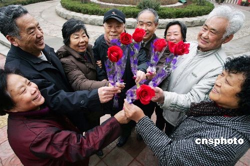 在山東濰坊市奎文區(qū)后門街社區(qū),一對(duì)對(duì)老年夫婦收到玫瑰花后喜笑顏開。在情人節(jié)來臨前,該社區(qū)開展了“執(zhí)子之手、與子偕老”活動(dòng),社區(qū)的老年夫妻互相送上了象征愛情的玫瑰花。中新社發(fā) 張馳 攝