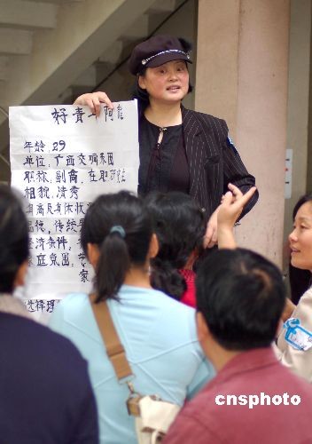 圖為一位媽媽手持簡介在賣力地推介自己的“好青年”兒子,吸引眾多相親人士。中新社發(fā) 劉萬強(qiáng) 攝