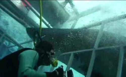 這一令人驚恐的事件是在兩名潛水者參加旅游公司所組織的“極限鯊魚深潛體驗(yàn)游”時(shí)發(fā)生的,他們當(dāng)時(shí)正在觀看那頭體重達(dá)2噸的大白鯊捕食金槍魚。一頭長(zhǎng)4.5米的大白鯊?fù)蝗幌蚪饘傧溆蝸?lái),大白鯊的頭部穿過了鐵欄桿,將鐵欄桿撞斷,兩名潛水者不得不趕緊逃生。