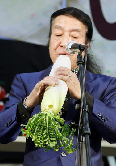 一名表演者在用白蘿卜演奏音樂(lè)。