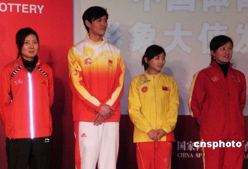 2月17日,中國國家體育總局體育彩票管理中心在北京舉行儀式,聘請六位體育明星擔(dān)任中國體育彩票公益形象大使。其中有杜麗、仲滿、何雯娜、張娟娟(從左至右)等四位北京奧運會冠軍。中新社發(fā) 沈晨 攝