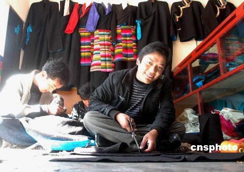 2月20日下午,在充滿(mǎn)節(jié)日氣氛的拉薩江蘇路“藏族傳統(tǒng)山南杰德秀郎布和西瑪服裝訂做室”,專(zhuān)做藏民族傳統(tǒng)服裝的幾個(gè)小伙子在制作漂亮的藏裝。一位叫邊巴次仁的青年表示,藏歷新年就要到了,藏民族新服裝賣(mài)得很俏,現(xiàn)在平均每天能銷(xiāo)售近十套,大家天天忙得加班。中新社發(fā) 周波 攝