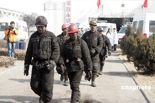 二月二十二日凌晨二時(shí)十七分,山西焦煤集團(tuán)西山煤電屯蘭煤礦發(fā)生瓦斯爆炸事故,目前已造成四十四人遇難。圖為已安全升井的礦工。中新社發(fā) 張?jiān)?攝