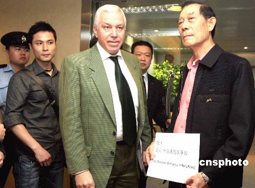 圖為香港海員工會(huì)主席郭錦華船長(zhǎng)(右一)向俄羅斯駐港領(lǐng)事館工作人員遞交抗議書。中新社發(fā) 張勤 攝