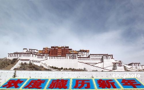 藏歷新年,在西藏拉薩宏偉的布達(dá)拉宮下,用紅色花朵拼成的“歡度藏歷新年”字幅,給古城拉薩增添了喜慶祥和的氛圍。中新社發(fā) 周波 攝
