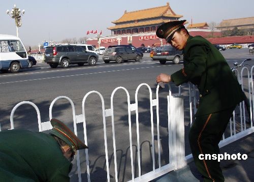 2月27日,全國“兩會”即將召開,北京天安門廣場進(jìn)行全面清潔整理工作,以迎接“兩會”開幕。中新社發(fā) 鄭雄增 攝